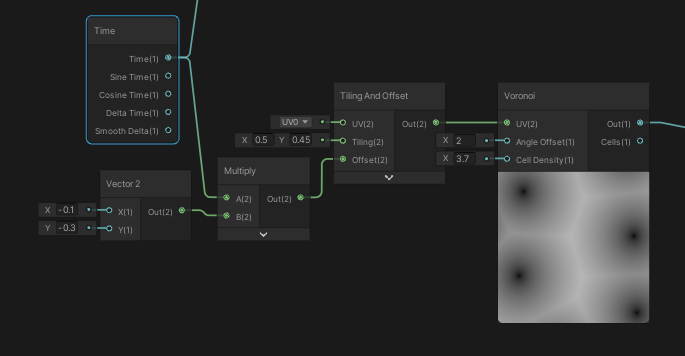 time과 vector2 x,y(0,-0.3)을 곱해서, tiling and offset에 offest으로 사용 택스쳐에 흐름을 만들어 줍니다.