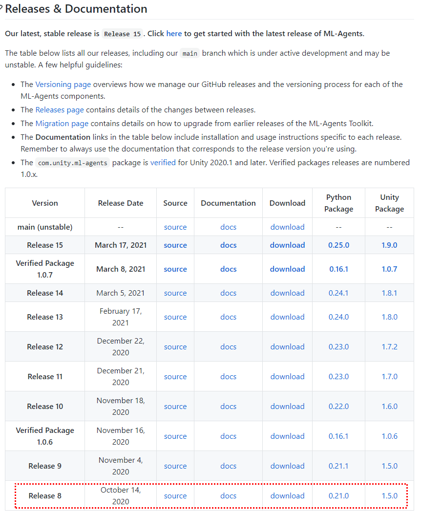 내가 구동에 성공한 버전은 Unity ML-Agents Release 8 이다.