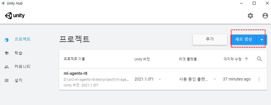 프로젝트 이름은 적당히 mlagent로 했다.