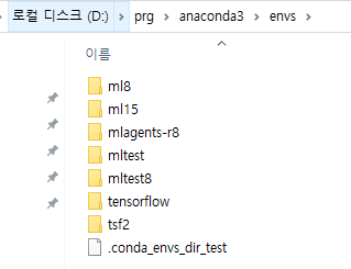 참고로 본인이 설치한 경로 아래에 envs 폴더가 존재하고 가상환경 파일들은 여기에 있다.