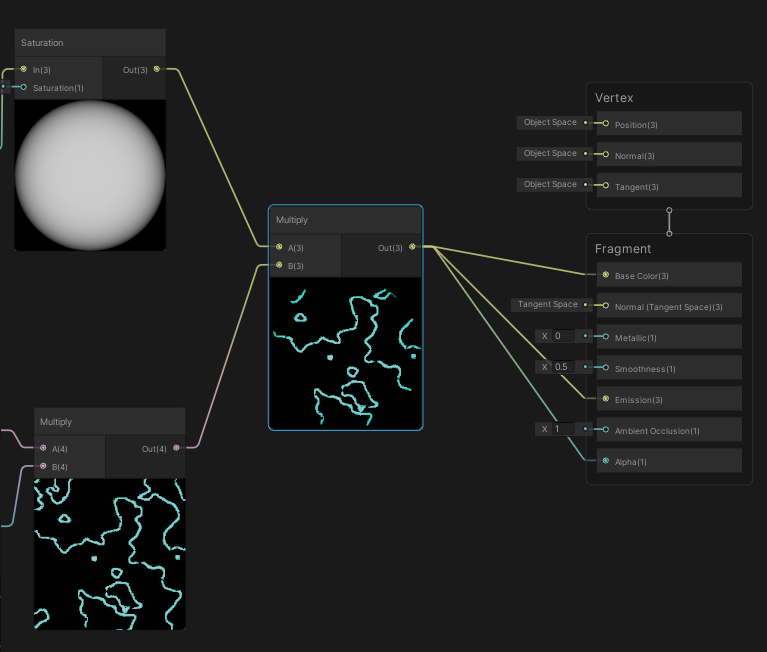 곱한 값을 BaseColor, Emission, Alpha에 넣습니다.