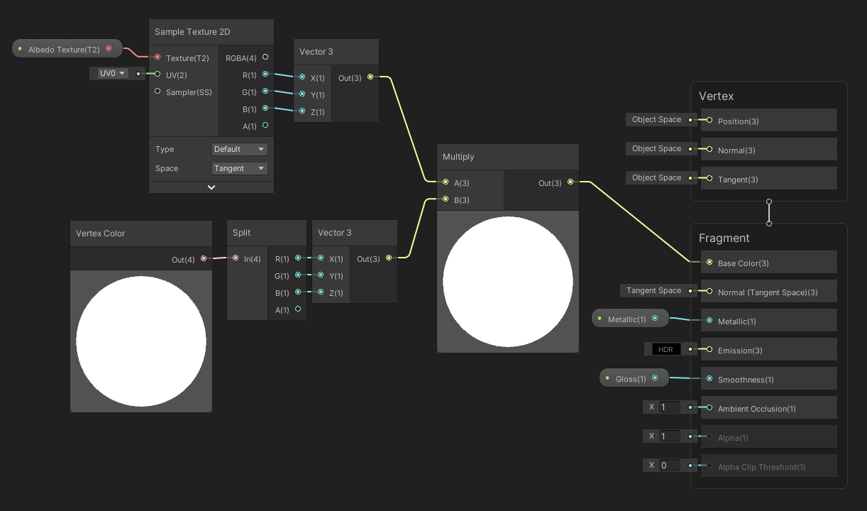 텍스처를 한장 가져와서 rgb를 뽑고, VertexColor로 부터 rgb를 가져와 곱해 출력하는 단순한 구성이다.