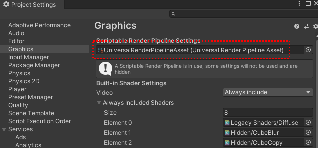 Graphics의 Scriptalbe Render Pipeline Settings에 넣어줍니다.