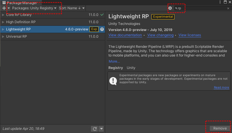몇 개가 뜨는데, LightweightRP는 예전에 사용하는 녀석이고,