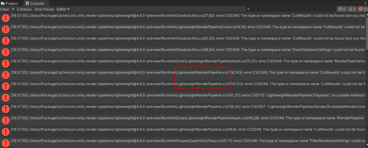 LightweightRenderPipeline 관련한 애러 입을 볼 수 있습니다.