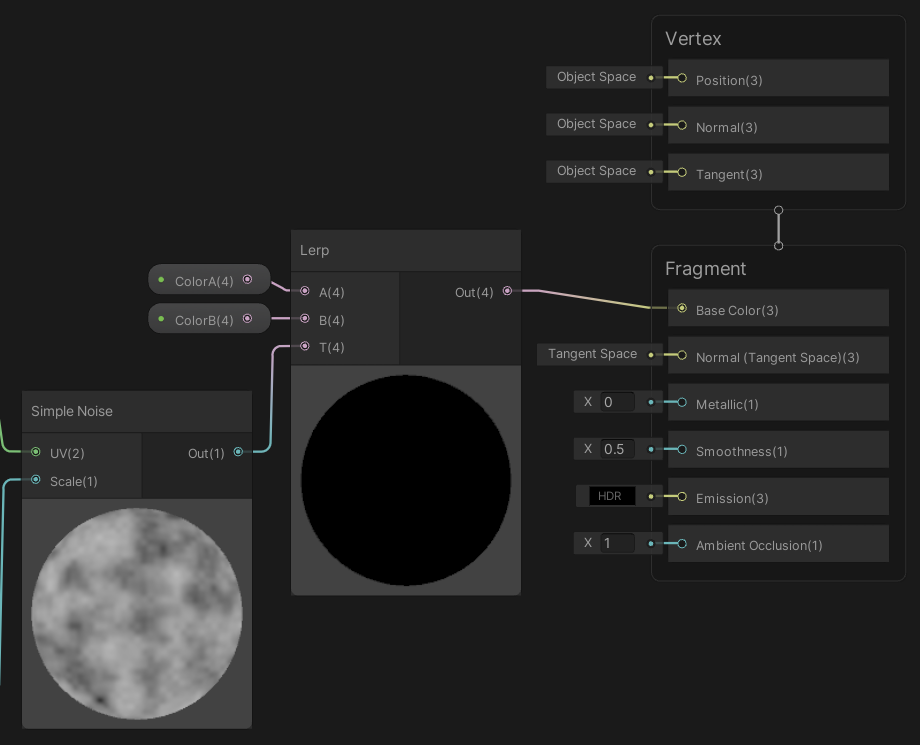 칼라 값을 외부에서 2개를 가져오게 만들고 Lerp 합니다. Lerp의 T값을 Noise출력밧으로 하고, Lerp 결과를 BaseColor에 넣습니다.